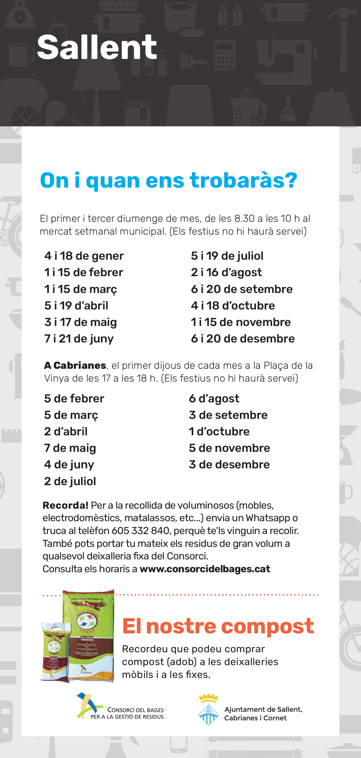 Per a la recollida de voluminosos (mobles, electrodomèstics, matalassos, etc...) truca al telèfon 605 33 28 40 perquè te'ls vinguin a recollir. També pots portar tu mateix els residus de gran volum a qualsevol deixalleria fixa del Consorci. Consulta els horaris a www.consorcidelbages.cat.